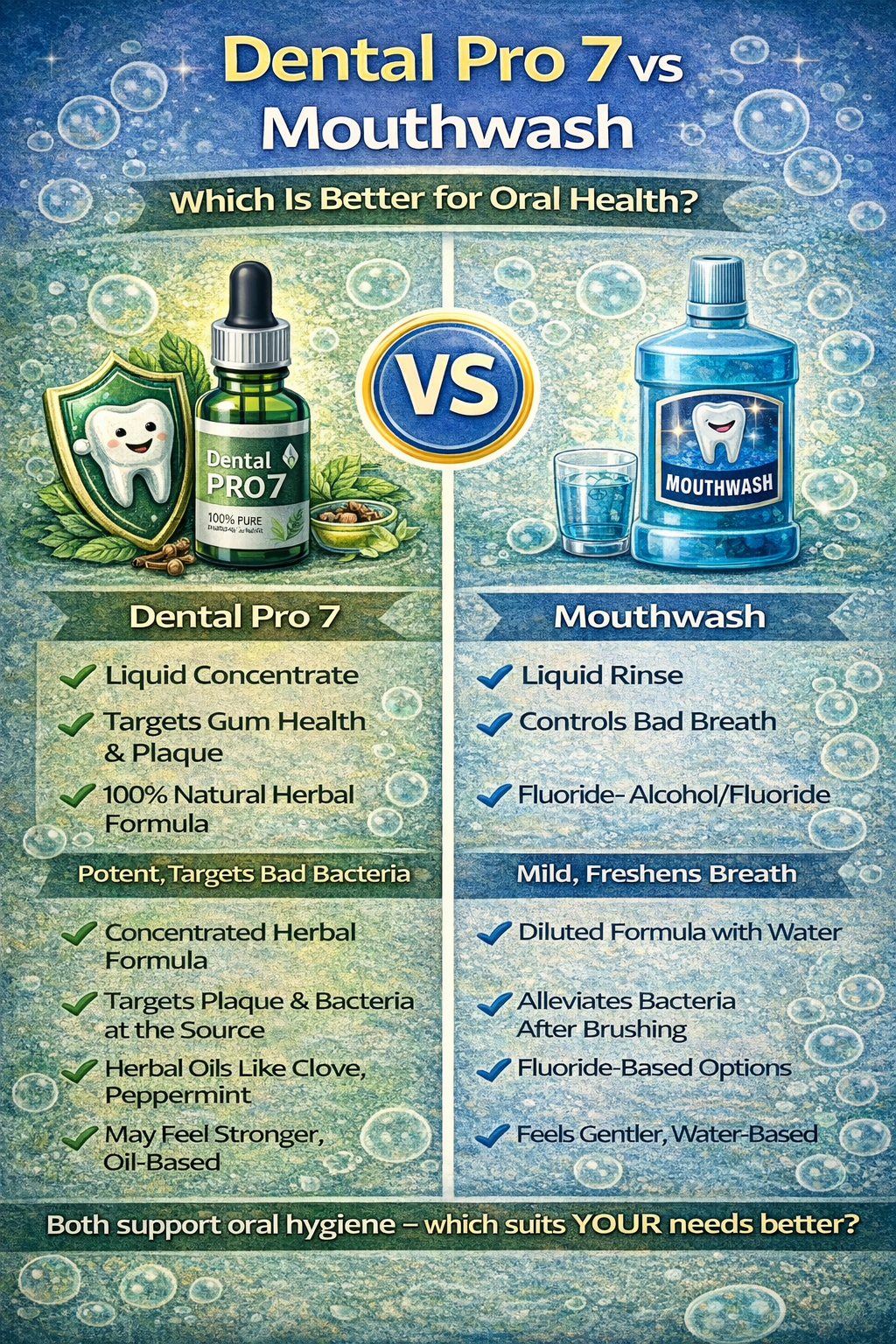 Because these two approaches serve different purposes, many people wonder how Dental Pro 7 vs mouthwash compares when it comes to supporting oral health.
